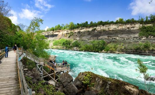 A hidden gem in Niagara Falls is the Niagara Parks White Water Walk. This serene boardwalk is located deep within the Niagara Gorge with an impressive, up-close view of the powerful class 6 white water rapids. You'll be immersed in the soothing roar of North America's largest series of standing waves as you make your way down the self-guided boardwalk to take in the crashing waves and an excellent view of the 410 million-year-old rock layers.